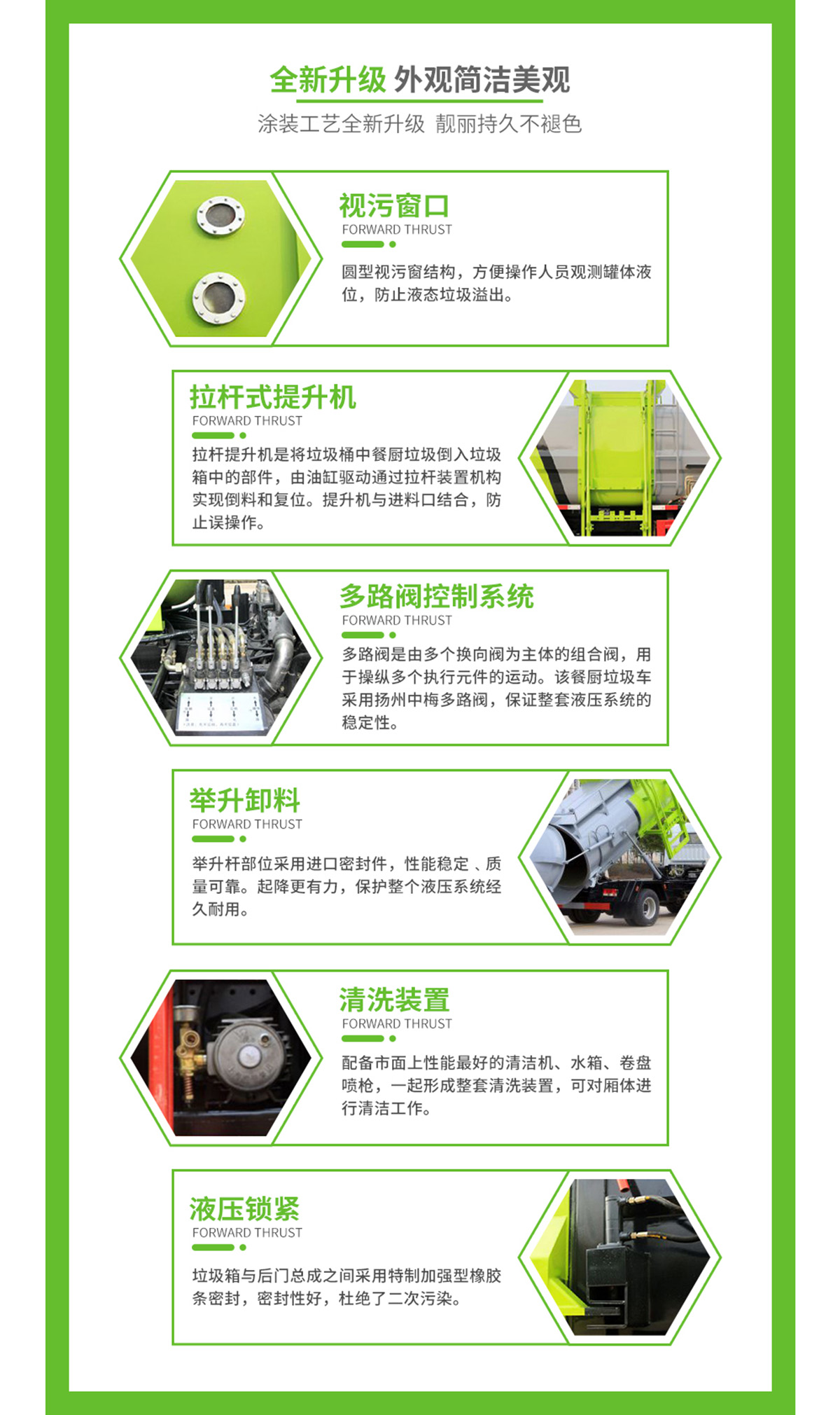東風8方餐廚垃圾車又稱廚余垃圾車、余廚垃圾車、餐廚垃圾收集車、泔水車等,是垃圾車的一種,主要用于收集和運輸生活垃圾,食品垃圾(泔水)及城市淤泥的專用車輛。可配裝載不同規格的標準垃圾桶,廣泛應用在賓館、飯店、食堂、學校等單位的餐廚泔水處理。具有裝、卸垃圾自動化程度高、工作可靠、密封性好、裝載容積大、操作簡便、作業過程密閉,無污水泄露和異味的散發,環保性好等特點。